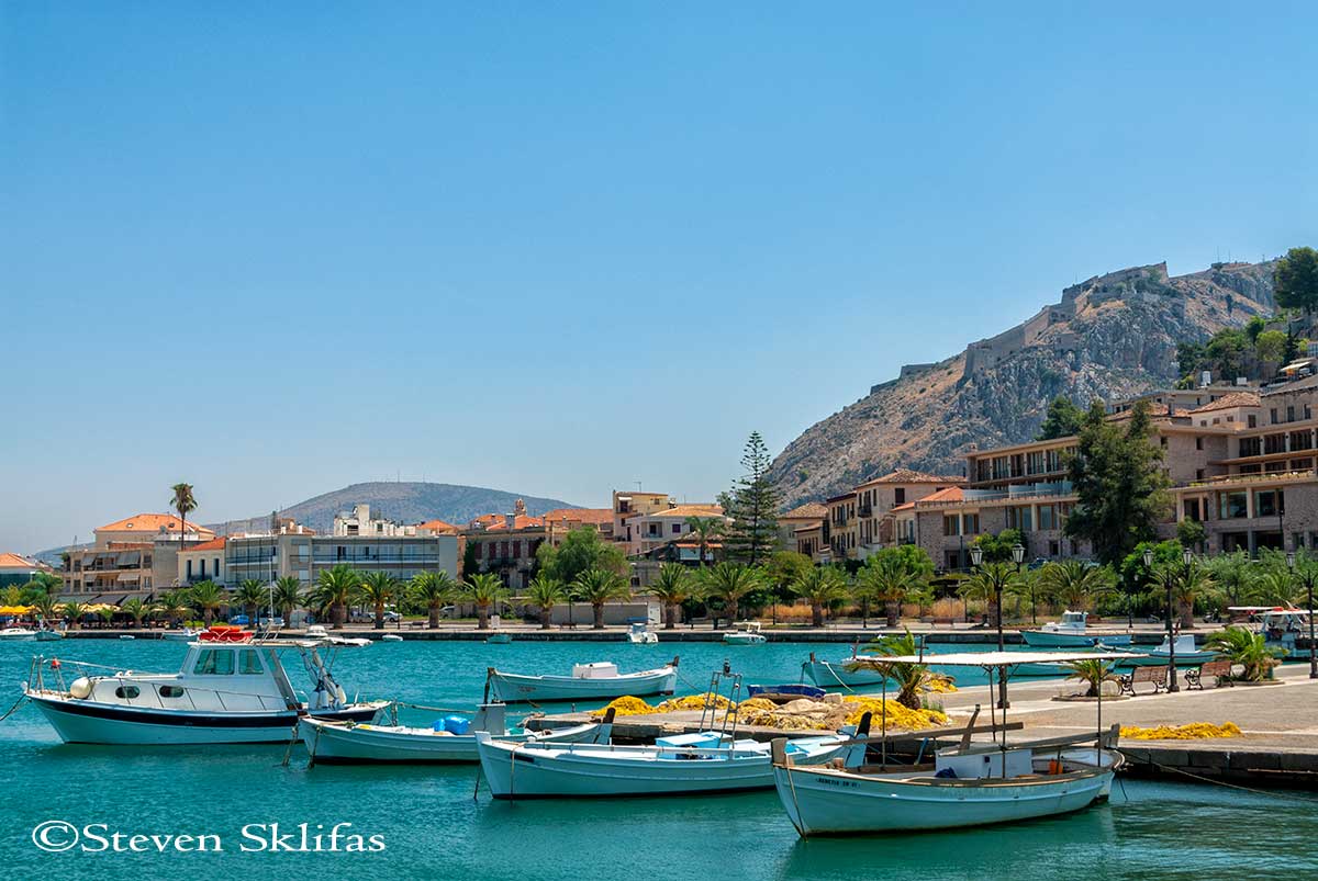 Small fishing boats in the harbour of the seaside town of Nafplio. Peloponnese. Greece. Above the town is the imposing Venetian fortress known as the Palamidi citadel which provides an amazing view of the surrounding sea to those who are willing to climb the 999 steps to the top.